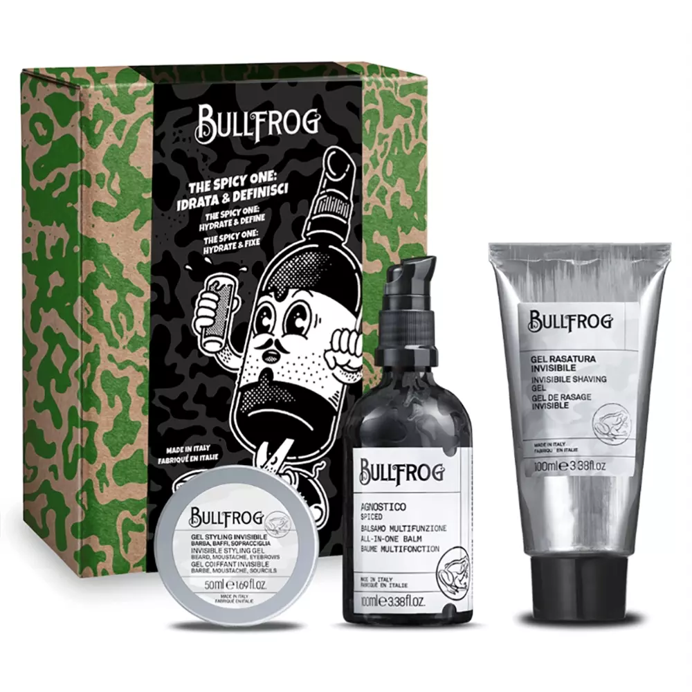 Súprava kozmetiky The Spicy One - Hydrate & Define - Bullfrog je komplexná starostlivosť o bradu, pokožku a vlasy. Obsahuje tri vysokokvalitné produkty, ktoré poskytujú účinnú starostlivosť a styling. Súprava kozmetiky The Spicy One - Hydrate & Define - Bullfrog obsahuje: balzam Agnostico Spiced s pikantnou, korenenou vôňou, ktorý zjemňuje a vyživuje bradu, pokožku a vlasy, transparentný gél na holenie, ktorý chráni pokožku pred porezaniami a podráždením vytvorením ochranného filmu medzi pokožkou a britvou, a bezvonný gél na styling brady, ktorý poskytuje silné držanie bez dojmu mokrých vlasov a dokonale modeluje bradu.