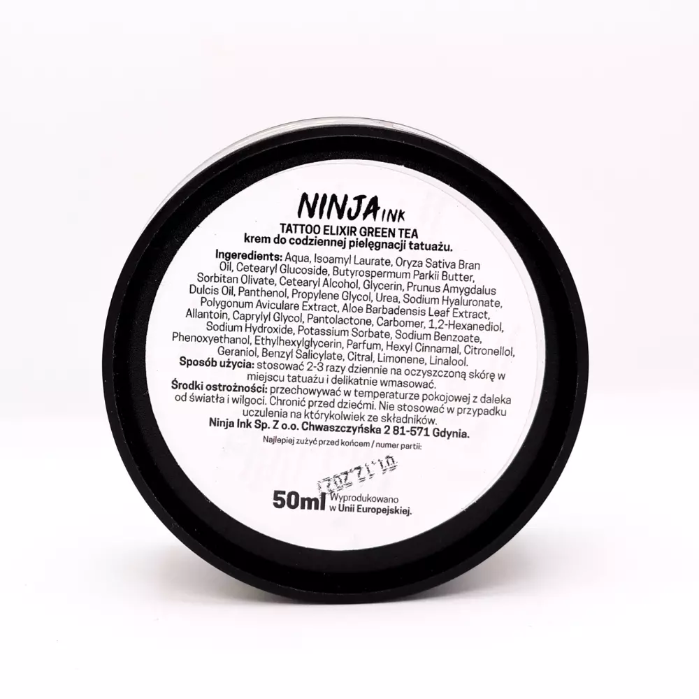 Krém na tetovanie Tattoo Elixir Green Tea - Ninja Ink vo veľkosti 50 ml je poľský kozmetický prípravok na starostlivosť o pokožku, vyrábaný z 94% prírodných zložiek. Jeho receptúra bola vytvorená tak, aby sa rýchlo a dobre vstrebávala, nezanechávala pocit lepkavosti a nešpinila oblečenie. Bohatstvo hydratačných zložiek, ako sú maslo shea, aloe a rastlinné oleje, robí krém na tetovanie Tattoo Elixir Green Tea - Ninja Ink ideálnym aj pre ľudí so sklonom k vysúšaniu pokožky.