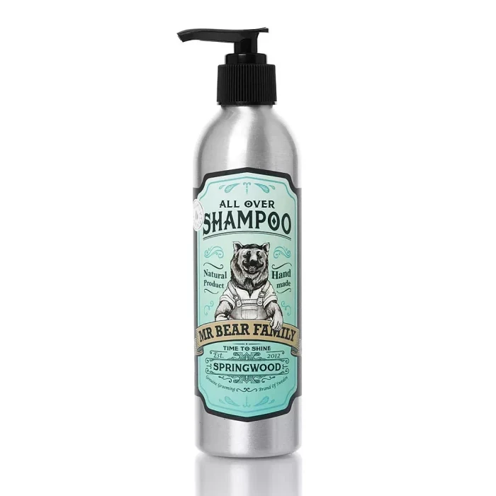 Šampón na vlasy a telo Springwood - Mr Bear Family je produktom švédskej značky, špecializujúcej sa na ručnú výrobu prírodných kozmetických výrobkov pre mužov v malých sériách. Vonné kompozície sú vytvorené z esenciálnych olejov a kovová fľaša má praktickú pumpičku pre ľahké dávkovanie produktu. Kvôli prírodnému zloženiu sa šampón peny menej ako štandardné šampóny.