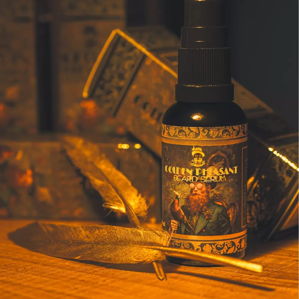Sérum na bradu Golden Pheasant - Rudy Cosmetics zaujme aj svojou koženou-drevitou vôňou, ktorá je výrazná a dlho pretrváva vďaka vysokému obsahu aromatických zložiek v produkte. Golden Pheasant je inšpirovaný postavou šľachtica Odara, Íra s poľskými koreňmi, ktorý je majstrom v obchode s drahocennými surovinami a chovateľom majestátnych bažantov. Ak chcete do svojej starostlivosti o bradu pridať luxusný prvok mužskej elegancie a zlepšiť vzhľad svojej brady, táto ponuka od poľskej značky Rudy Cosmetics je pre vás tou správnou voľbou!